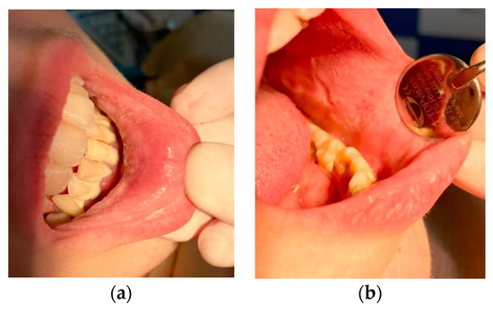 Chronic keratosis (Morsicatio buccarul) in a 16-year-old girl: (a) keratotic lesion on the oral mucosa of the inferior lip/plaque-induced gingivitis; (b) keratotic lesion on the oral mucosa of the left cheek.