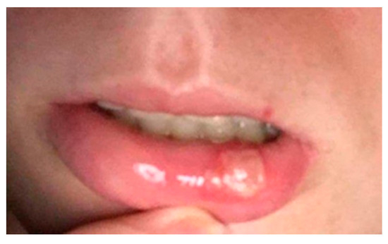 - Millogo, M.; Ouedraogo, R.W.L.; Ily, V.; Konsem, T.; Ouedraogo, D. Labial lesions by human bite. J. Oral Med. Oral Surg. 2018, 24, 153–156. [Google Scholar] [CrossRef]