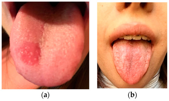 (a) Geographic tongue affecting a 16-year-old girl; (b) Geographic tongue affecting a 17-year-old girl.