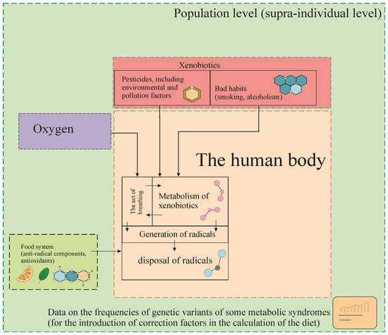 The article proposes an algorithm for an approximate assessment of the molar volume of free radicals generated in the human body per day. It takes into account the act of breathing, physical activity, food consumption, the influence of unfavorable environmental conditions, exposure to xenobiotics, as well as bad habits (alcohol and tobacco smoking). A calculation of the required set of the most commonly used food products for the disposal of free radicals was made. The calculation is a structure of four blocks with the possibility of adding optional data from human population genetic studies, environmental conditions, etc. In the proposed algorithm, the results of antiradical activity (ARA) of food products are used as input, including the results of predicting antiradical activity using artificial neural networks (ANN), which we published earlier. Based on the accepted values of one equivalent (in terms of the activity of 1 μmol of ascorbic acid), it was shown (for our data) that for the utilization of all free radicals produced in the human body per day, it will take an average of ≈260 to ≈540 g of food components in terms of dry mass (including proteins, fats, carbohydrates, etc.). At the same time, for the utilization of consumed xenobiotics, from 220 mg (in terms of vitamin C) to 260 mg (in terms of acetylcysteine -NAC) of additional plastic components or 11.5–13.0 g of essential amino acids will be required, which must be taken into account when calculating diets. This approach will be useful in the development of new functional foods, as well as in assessing the possible impact of diets on human health. Another applied point of this study is related to the possibility of using these data for better detailing and selection of food products for people working in conditions of increased radiation (in space conditions), in contact with harmful substances (chemical synthesis and production), for people practicing increased physical activity (bodybuilding and sports), and for the purposes of medical nutritional therapy.
