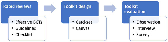 The toolkit was then developed based on the effective BCTs and the checklist, while a hackathon was planned based on the guidelines and the toolkit was evaluated in the hackathon. In this paper, we focus on the evaluation of the toolkit, and the evaluation of the hackathon is reported elsewhere [37]. The design process of the toolkit is described in the following paragraph. The main reason why we evaluated the toolkit in a hackathon is that the hackathon offers a real-life challenge for co-designers; additionally, the limited resources and time encourage participants to think creatively and collaborate effectively. Moreover, given the stage of development of our toolkit, a hackathon could help us to quickly evaluate our toolkit before the next iteration. In contrast, a design project can last for a number of weeks, so it is not cost-effective for researchers to undertake observations throughout, especially when there are several teams. Evaluating the toolkit in a design project might only be worthwhile after we improved our toolkit based on the hackathon.