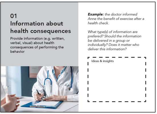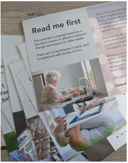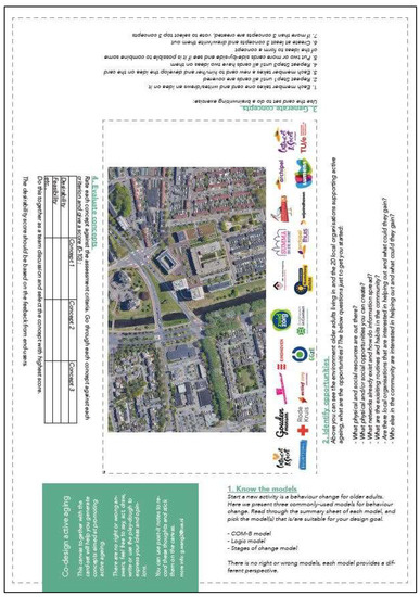 The toolkit contains a card-set (17 cards of size A5) and a canvas (size A1). The aims of the toolkit and how it is intended to be used can be found in the Methods section. A snapshot of the card-set and canvas can be found in Figure 2 and Figure 3 respectively. To ensure the user-friendliness of the card-set, the effective BCTs were grouped into sets of 16 cards based on their similarities. The intro card of the card-set introduces a fictional character Anna and her challenges in helping users build empathy, and the remaining cards each focus on one effective BCT for OA. “Users”, refer to the users of the toolkit. Each BCT card consists of a definition of the BCT, an example of Anna applying the BCT, an illustration photo, several stimulating questions, and a blank space for users to record their ideas and insights. An example of the BCT card is shown in Figure 4. One side of the card is in English, and the other side is in Dutch (the native language of the OA participants). For the canvas, an Open Street map of the neighbourhood in which OA live was positioned in the centre, together with the names of local organisations that support active ageing. The description of each design stage was laid out facing towards the four sides of the canvas, and the intention was to let participants put the canvas on the table, sit around it, and take turns to lead in each design stage. The canvas is in English only because it is intended to be used by the student participants, who are fluent in English and some of whom cannot speak Dutch. We assumed the students would easily explain each design stage to OA via conversations during the hackathon. The full-size version of both the card-set and the canvas can be found via the OSF link: https://osf.io/g6479, accessed on 10 October 2022.
