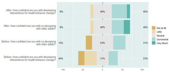 The quantitative analysis of the surveys indicated there was an increase in the confidence levels of students in regard to the design of health behaviour change and in co-designing with OA. The confidence levels before and after the hackathon are displayed in Figure 5, which depicts a Likert-scale score ranging from “Not at all” (1) to “Very much” (5), with the x-axis indicating the percentage of respondents selecting a grading. The y-axis presents two questions that were posed to participants before and after the hackathon: (1) How confident are you with co-designing with OA? and (2) How confident are you with developing interventions for health behaviour change? Notably, no participants selected 5 for “Very much” before the hackathon for either question, potentially indicating a level of hesitation in regard to the co-design process. The percentages in the figure refer to the positivity compared to the negativity toward the questions. For example, for the first question, ‘After: How confident are you with developing interventions for health behaviour change?’, 8% answered negatively, 46% were neutral and 46% said they were more confident.