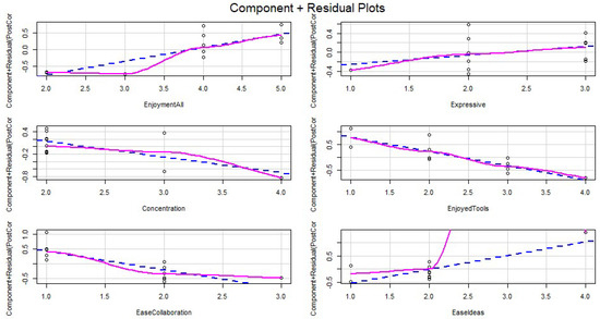The component-plus-residual plots for all predictor variables are displayed in Figure 6. The blue dashed line indicates where the linear relationship should be, and the purple continuous line refers to the estimated linear relationship. Ease_Ideas appears to be the least accurate (when compared with the other 5) as the purple line diverges significantly from the blue linear relationship.