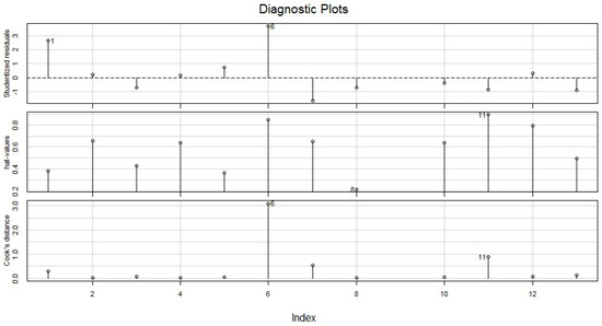 The multiple linear regression analysis produces a multiple R-squared value of 0.847 (with an adjusted R-squared of 0.662) and a residual standard error of 0.464. In Figure 7, the diagnostic plots display the 13 participants on the x-axis, with the influence values (cook), outliers (studentised) and leverage (hat) on the y-axis, where a Cook’s distance (d-value) > 1 is indicative of influence. The plot indicates that participant 6 had an influence on the findings with a d-value of 3 (where >1 indicates influence) and is also a clear outlier in the studentised graph when visually compared to the others. Investigating the survey responses of the individual may offer insight into the reason for the high outlier score. In the pre-survey, the participant had also previously worked on projects related to interventions (e.g., design/activity) for health behaviour change and worked with OA before the hackathon. The individual’s confidence level was high both before and after the event while this individual responded to other questions as follows: Enjoyment_All: 4, Expressive: 2, Concentration: 2, Enjoyed_Tools: 1, Ease_Collaboration: 3, Ease_Ideas: 2. An indication of the higher outlier score visible in the diagnostics plot (Figure 7) may be due to the participant’s selection of high scores for confidence and enjoyment, yet relatively low scores for all other categories. In this case, it could be that the confidence is due to the participant’s previous experience and enjoyment of the topic rather than the event itself.