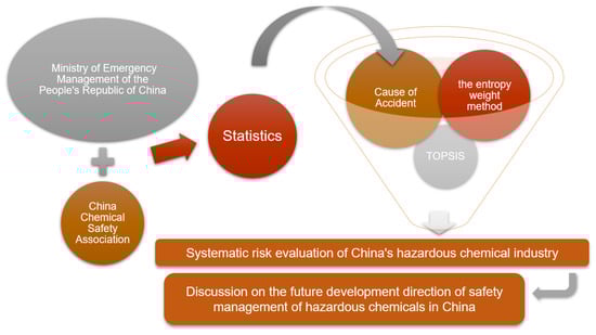 First, the causes of accidents are extracted and classified. Four indicators of personnel factor (human), equipment factor (machine), environment factor (environment), and management factor (management) are used as classification criteria and elaborated for each indicator. Then the system risk of monthly (yearly) accident statistics is calculated by using the entropy weight method and TOPSIS, and the calculated results are compared with the statistical results for verification, and the system risk of China’s hazardous chemical industry is evaluated, and finally, improvement suggestions are made according to the evaluation results. The research line of this paper is shown in Figure 1.