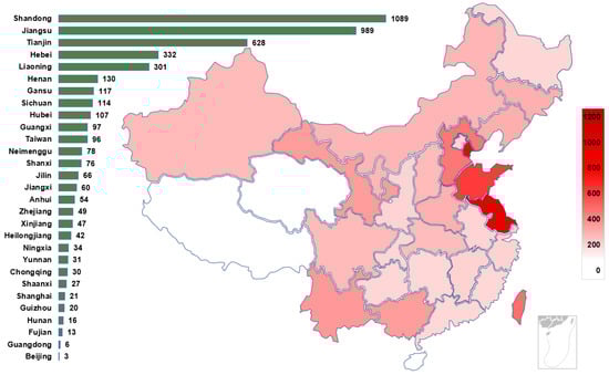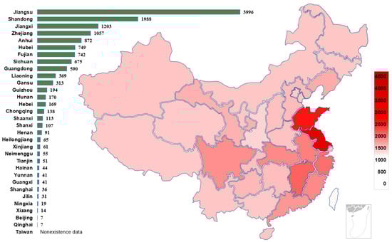 In China, the chemical and petroleum industry is a traditional pillar industry []. Therefore, each province attaches great importance to the petrochemical industry and has established a certain number of petrochemical plants. Figure 2 shows the distribution of casualties of these 195 accidents in the provincial areas of China according to the regional distribution of the cases. The darker the color, the higher the number of casualties in HCA. The number of accident fatalities varies greatly by province, with some provinces having far more fatalities than others. Such as Jiangsu Province, with 192 fatalities between 2000 and 2020, accounting for 15.1% of the total fatalities. Figure 3 shows the regional distribution of the number of enterprises in the hazardous chemical industry in China as of 2022. Comparing Figure 2 and Figure 3, it is obvious to see the consistency of the number of hazardous chemical casualties and the regional distribution of hazardous chemical enterprises. The number of enterprises and accident casualties in the eastern coastal provinces of China is much higher than those in other regions. Many studies have noted regional differences in HCA [], the frequency of accidents was highest in Guangdong Province from 2000–2006, followed by Zhejiang Province and Jiangsu Province. However, the statistical results given in this paper are different from those of the above-mentioned studies. The reason is that many small-scale incidents are not included as statistical subjects. In this study, cases of larger and more serious chemical accidents are chosen and studied. The analysis of these cases is listed in Appendix A.