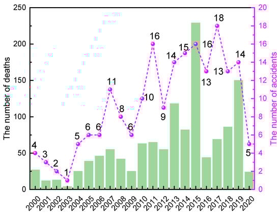 Two sources of data on HCA in China were used for this study: the official website of the Ministry of Emergency Management of the People’s Republic of China and the official website of the China Chemical Safety Association (CCSA). The Ministry of Emergency Management of the People’s Republic of China is a government agency established in 2018, which is the most authoritative source of statistical data on various disaster events (HCA) in China. The China Chemical Safety Association (CCSA), established in 2006, is a social group engaged in chemical safety communication in China. The hazardous chemical accident column of CCSA can provide detailed hazardous chemical accident reports. Numerous researchers chose it as a data source in their research work on accident statistical analysis []. In this study, data on 195 cases of LAHCA that occurred in China from 2000 to 2020 were collected.