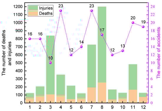 There are large fluctuations in the monthly distribution of HCA in China. The majority of mishaps and fatalities in the first half of the year happened in March and April, as illustrated in Figure 5. The Chinese New Year occurs in January and February, while the majority of Chinese businesses resume operations in March and April. These events bring a significant influx of people and potentially dangerous substances, which frequently results in accidents []. The number of accidents and fatalities in July and August in the second half of the year is significantly higher compared to other months, which are two of the hottest months in China [], and the highest number of casualties in China each year is also in July and August. The release of energy in the event of an accident is directly related to the temperature, and most hazardous chemicals are more likely to diffuse in a high-temperature environment than in a low or ambient environment, making them more likely to cause accidents. High temperatures can have a significant impact on chemical reactions []. In their study, Wang et al. [] examined the features of dangerous chemical mishaps that occurred in China during the high-temperature season. Employees are more susceptible to attention and exhaustion in hot environments, which can lead to dangerous conduct and serious accidents.