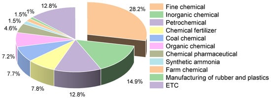 Chemical manufacturing encompasses a pretty broad spectrum of industries and a vast range of chemical products. In this study, 195 collected accidents were divided into eleven categories: fine chemicals, inorganic chemicals, organic chemicals, petrochemicals, coal chemicals, chemical fertilizers, chemical pharmaceuticals, rubber and plastic manufacturing, synthetic ammonia, farm chemical, and others. Most of the accidents were concentrated in the fine chemical, inorganic chemical, and petrochemical industries. As shown in Figure 6, where the highest percentage of accidents was in the fine chemical industry, with 55 accidents accounting for 28.2% of the total number of accidents. Figure 7 shows that the number of accident casualties in the fine chemical industry in the same proportion of all industries is higher, the total number of casualties reached 1317, accounting for 28.2% of the total number of casualties, which is directly related to the characteristics of the fine chemical process long, unit reaction, raw materials complex [], etc. Fine chemical manufacturing processes are characterized by highly variable, challenging-to-control conditions, and a large-scale management system. Additionally, any issue that arises during any stage of this continuous production process will result in a transfer of risk. When emergency measures are not maintained, the situation is frequently serious and challenging to control. For instance, a dichlorobenzene plant explosion happened in a fine chemical plant in Lianyungang in 2017 as a result of chemicals from the tail gas treatment system cascading into the reactor and violently reacting to generate high pressure, which caused an explosion in the workshop when the pressure was released, and the adjacent plant also collapsed by the impact, killing 10 people []. China’s fine chemical industry is relatively weak compared to developed countries [], the safety management level is also relatively backward, and the development process of the fine chemical industry does not match the level of safety, which leads to the frequent occurrence of large-scale accidents.