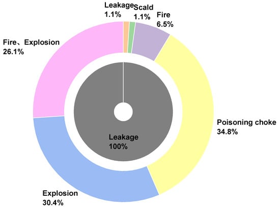 Leakage is the most common form of failure of the chemical production equipment []. Due to the wide variety and nature of hazardous chemicals and different triggering conditions of leaks, the existing preventive measures cannot eliminate the possibility of sudden leakage accidents []. And as can be seen from the percentage of spill accident types (Figure 8), there was only one single type of spill accident among 92 spills, and 97.8% of spills resulted in poisoning and asphyxiation, fire, and explosion accidents. Therefore, in the development process of hazardous chemical emergencies, leaks often act as the initiating event of larger accidents and above, which means that leaks are at the front end of the chain of hazardous chemical emergencies. Moreover, the form of uncontrolled release of hazardous chemical energy is also affected by the mechanism of leakage and the nature of hazardous chemicals.