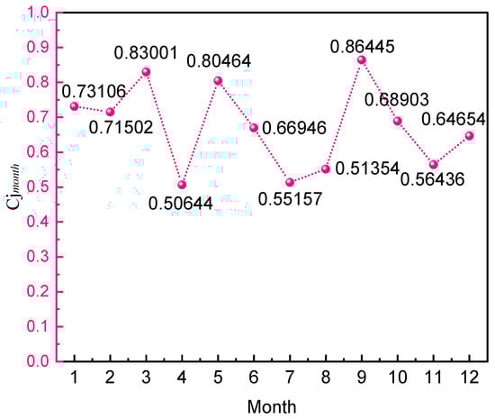 The comprehensive risk evaluation index reflects the magnitude of system safety, the smaller the value, the more dangerous the system is, and vice versa, the safer it is and is used for the longitudinal evaluation of the system. Based on Equation (13), the calculation is carried out for monthly and annual initial data, and the results are shown in Table 6 and Table 7 and Figure 9 and Figure 10, and the calculation results correspond to the statistical results in the previous part.