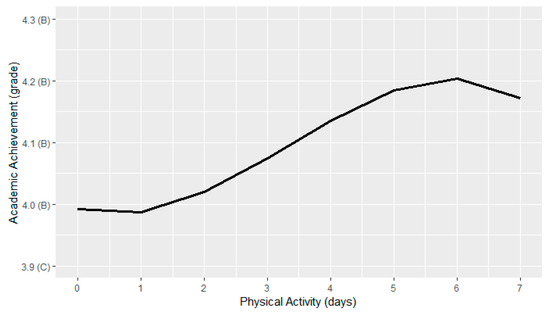 Although our finding of a curvilinear relationship between physical activity and academic achievement is in contrast to a previous study that observed a linear relationship despite testing non-linear terms [40], closer inspection of our results suggest relatively linear improvements in academic achievement are observed between one to five days of weekly physical activity engagement. Moreover, results from both studies, and the overarching body of literature indicates that a physically inactive lifestyle or engaging in very low amounts of physical activity is linked to the poorest levels of academic achievement [23]. Taken together, existing evidence provides partial support for the notion that “every move counts” [41], but physical activity promotion efforts should recognize that guideline adherence may be unnecessary for optimal benefits depending on the outcome of interest—academic achievement in this case. Light-intensity physical activity—which does not have a threshold-based public health recommendation—has been shown to positively influence learning during adolescence [42] and therefore could in turn provide additional benefits for academic achievement, but lower intensities of physical activity engagement were not captured by the YRBSS survey. Nevertheless, setting lower physical activity targets such as accruing at least 60 min of moderate-to-vigorous physical activity on five out of seven days of the week could address the knowledge translation issue of an all-or-nothing threshold-based approach and provide many adolescents with the knowledge that they can act upon to improve their grades [43].