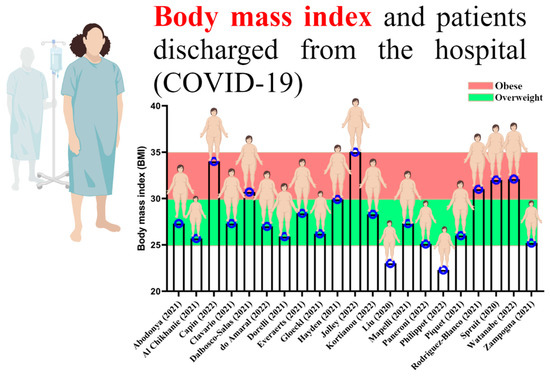 Body mass index of patients with COVID-19 discharged from the hospital [37,38,39,40,41,42,43,44,45,46,47,48,49,50,51,52,53,54,55,56].