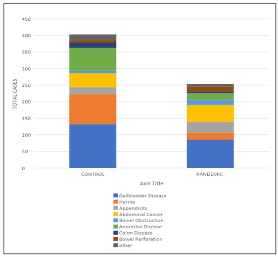 Figure 1 demonstrates that a statistically significant reduction (37.2%) was observed in the total number of surgically diagnosed and treated patients in the control group in comparison with the lockdown group (p = 0.014).