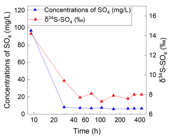 The δ34S-SO4 values of the effluent water samples ranged from 7.3‰ to 14.2‰, while the δ18O-SO4 values ranged from −2.0‰ to 5.9‰ (Figure 3). The δ34S-SO4 changed from 14.2‰ to 8.0‰, and the δ18O-SO4 changed from 5.9‰ to −1.9‰ from the beginning to the end of the experiment.