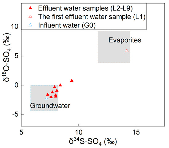 Sulfur and oxygen isotope distribution in the effluent water (the ranges of the δ34S-SO4 and δ18O-SO4 values of SO4-containing evaporites and groundwater were adopted from Long et al. [21].