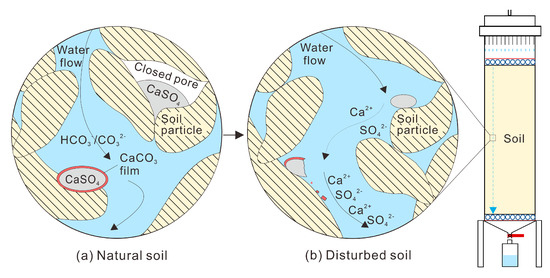 Under natural conditions, water moves in an unsaturated flow. Although the water in the soil column had an unsaturated flow, the simulated rainfall generated by the rain simulator percolated in different flow paths. In the process of percolation, unsaturated water can bypass the larger pore channel and form a layer of water film on the surface of soil particles. With the continuous thickening of the water film, the gas in the soil would be trapped in the pores under natural conditions [33]. Under experimental conditions, the soil was disturbed, and the particle morphology and pore structure were changed. Consequently, the pore water and gas adsorption equilibrium in the soil was broken [34]. Furthermore, the transport paths of water, solute, and suspended colloid were changed [35], which accelerated the connection of the water phase in soil pores and the escape process of the originally connected gas phase [34]. Following this, the released percolation channel was occupied by water again. At this time, SO4-containing evaporites that were not on the water migration path under natural conditions would have come into contact and dissolved with the water under the new migration path conditions (Figure 4). Some gases that cannot be expelled appear unconnected and are called closed bubbles [34]. The residual SO4-containing evaporites in the column may be wrapped by closed bubbles or calcium carbonate film [21]. When SO4-containing evaporites exist in some undamaged closed pores, the dissolution of some SO4-containing evaporites can also be hindered.