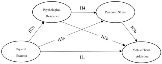 Academic research has focused on individual internal psychological factors such as perceived stress, social anxiety, alexithymia [21,22,23,24,25,26,27], etc. Nevertheless, few studies have focused on how physical exercise may affect college students’ mobile phone addiction behavior, and research on the interactive mechanism between the two is inadequate. Thus, this study takes Chinese college students as the subjects to construct a chain mediation model, introduces psychological resilience and perceived stress into the model, and explores the role they play in physical exercise and mobile phone addiction, providing some references for future studies of college students’ mobile phone addiction.