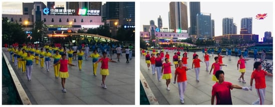 According to the economic development plan of the Chinese government, collective physical activities began in squares in tandem with urban revitalization. The local governments spent significant amounts of money on building cultural squares that complemented each city’s characteristics to carry out Deng Xiaoping’s so-called “hold with both hands but hold tight” policy, which emphasized economic construction in conjunction with spiritual civilization and development []. Since the mid-1990s, squares have become a hot topic in China’s urban construction and an important means of embodying a city’s shape, displaying its history and culture, and promoting urban development. Because the country has a large population and stadium facilities are relatively scarce, people who want to participate in sports naturally flow toward squares, whose number is much greater.