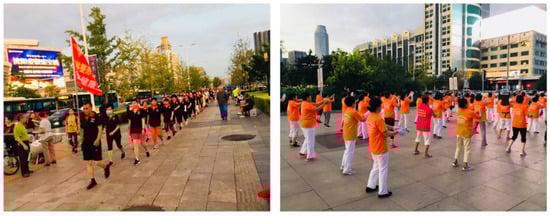 Large groups of people dancing or exercising in the evening in the squares is a common sight in China. The physical activities, performed collectively in a square and ranging from the martial art form Tai Chi to disco and free-style dancing, are called square sports (It refers to all physical activities collectively performed along with music by a large number of people gathered in a square, such as gymnastics, walking, jumping rope, dancing, jianzi, and Tai Chi. There are various terms for these actions, such as square dance, square gymnastics, square dancing, etc. In this study, square sports refer to all physical activities performed in the squares). They can be considered a unique form of the popular leisure culture of the Chinese, which anyone can easily enjoy, regardless of age or sex, and is particularly popular among middle-aged women [,].