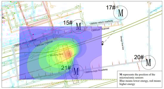 The microseismic events that occurred at the 1366 working face of Hengda Coal Mine are analyzed, and the sequential distribution of microseismic energy within the monitoring range is shown in Figure 2.