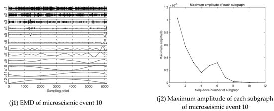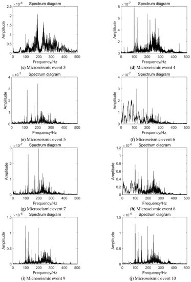 Comparing event 1 with the other nine microseismic events, the maximum amplitudes of all subgraphs of event 1 are obviously higher than the other nine events as a whole. For example, in the IMF component subgraph decomposed by event 1, the amplitude of the first subgraph is 7.04 × 10−4. However, in the first IMF component subgraph of other events, the magnitude of the maximum amplitude is mainly concentrated in 10−5 and 10−6.