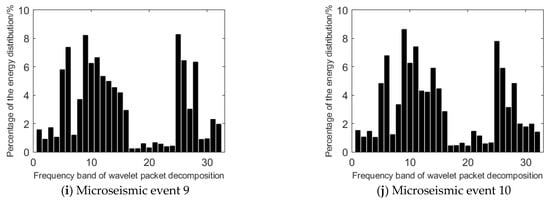 Wavelet packet transform is used to analyze the frequency band energy of the high-energy event and the events before the occurrence of high-energy event. The db8 wavelet basis function is selected to decompose the microseismic signal into 5 wavelet packets. In the fifth layer, there are 32 wavelet packets, and the whole frequency domain is divided into 32 sub-bands. The percentage of the energy of each node in the fifth layer wavelet packet decomposition is calculated to the total energy of microseismic signal. The results are shown in Figure 6.