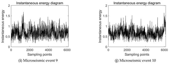 Further analysis of the instantaneous energy diagram of microseismic events shows that, among the 0–6000 sampling points sampled by sensors, the high value of instantaneous energy of event 1 is mainly distributed between 1800 and 2800 sampling points, and the instantaneous energy tends to 0 in the rest of the time interval. It shows a trend that rises steeply from zero to the highest point and then drops steeply to zero, namely the “inverted V type” trend, which is reflected in the instantaneous release of higher energy. The overall instantaneous energy of microseismic events 2, 3, 4, 5, 7, 9 and 10 is higher in all 0–6000 sampling points, most of which are above 0.2, and compared with microseismic event 1, instantaneous energy does not show a single “inverted V type” trend that rises steeply from zero to the highest point and then drops steeply to zero, but shows a fluctuation pattern that fluctuates in the whole sampling interval. Although event 6 and event 8 also show an “inverted V type” trend similar to event 1, compared with event 1, except for the peak value within the sampling time, the instantaneous energy of other sampling points does not approach 0, but fluctuates up and down at a fixed value.