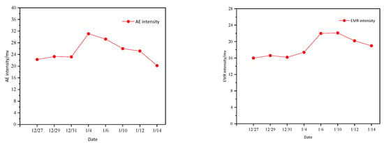 Statistics of acoustic emissions and electromagnetic radiation intensity for the occurrence date and extension date of the microseismic events analyzed above are shown in Figure 9.