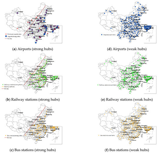 Compared to the strong airport hubs, strong hubs of railway and bus stations were much more densely distributed. Nearly 36% of cities have train stations which were classified as strong hubs, while the number for bus stations and airports were 23% and 11%, respectively. Mostly in megacities with a population of 10 million or more, airports that were classified as strong hubs are shown in Figure 3a with a dotted distribution pattern. This allowed the epidemic to spread from Wuhan to distant provinces via air transportation. The railway stations that were classified as strong hubs demonstrated dispersion belt distribution, as well as extending along the national high-speed railway network of four vertical and four horizontal (Figure 3b). This feature allowed the epidemic to spread to the eastern region. Figure 3c presents the aggregate cluster distribution at the strong hubs of bus stations, which was the primary factor in epidemic transmission to cities near Wuhan.