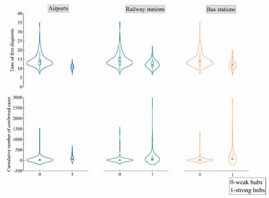 The strong hubs were located mainly in the eastern region and roughly bordered by the Hu Huanyong line (i.e., a comparison line proposed by geographer Hu Huanyong to classify the population density of the country).The weak hubs were scattered in small and medium-sized cities in various provinces. Combined with the spatial distribution of the epidemic (Figure 2), it can be found that cities with strong hubs reported the first case earlier, and had a higher cumulative number of confirmed cases.