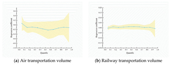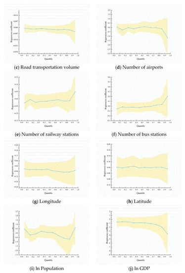 Previous studies have shown the variability in the timing of the occurrence of the first confirmed cases in different cities. Therefore, it was necessary to study the extent to which different transportation modes affected the transmission speed. Common conditional mean regression is more demanding on the data set itself, as it requires the dependent variable to adhere to conditions such as normal distribution. Additionally, it is prone to interference from outliers. Quantile regression is an extension of traditional linear regression, which can accurately fit the complete distribution of the dependent variable [29], and this model is more robust to outliers [24]. Therefore, we utilized a quantile regression model to clarify the influence of different transportation modes on the epidemic transmission.