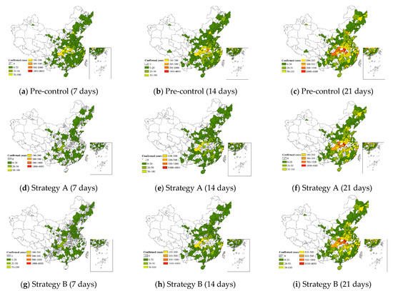 According to the study mentioned above, cities with strong hubs were significantly associated with the epidemic spread. Therefore, we considered the level of transportation facilities, based on Strategy A. In Strategy B, we adopted Strategy A’s cancellation ratio for cities with strong hubs, while cities without strong hubs were reduced to half. Figure 6 shows the fitted epidemic transmission at various time intervals (7 days, 14 days, and 21 days). Similarly, Table 9 demonstrates the number of infected cities, as well as the number of confirmed cases for various intervals of infection under different prevention levels.