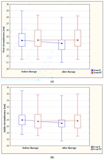A statistically significant decrease in foot circumference after therapy was found in the study group (p = 0.029). The difference in foot circumference after the procedures in the control group (GC) was not statistically significant (p = 1.000).