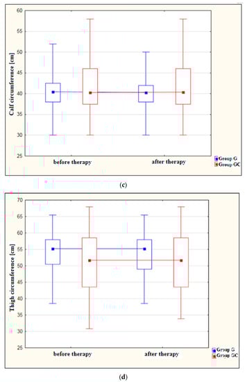 Figure 1a–d shows results for foot, ankle, calf and thigh circumferences [cm] in the study and control groups before and after the administered course of treatments.