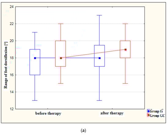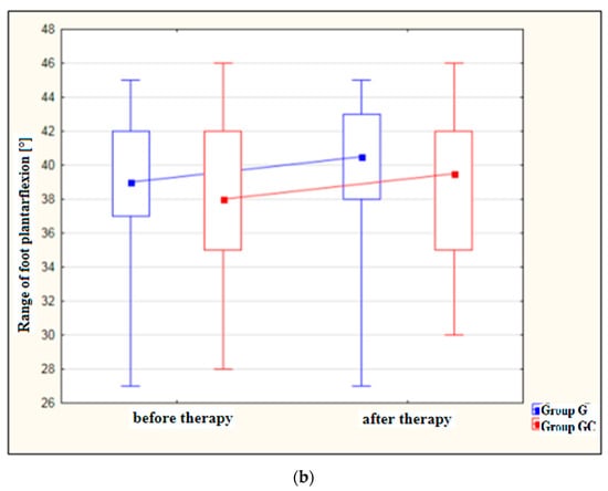 Figure 2a,b presents results for foot dorsiflexion and plantarflexion [°] in the study and control groups before and after therapy.