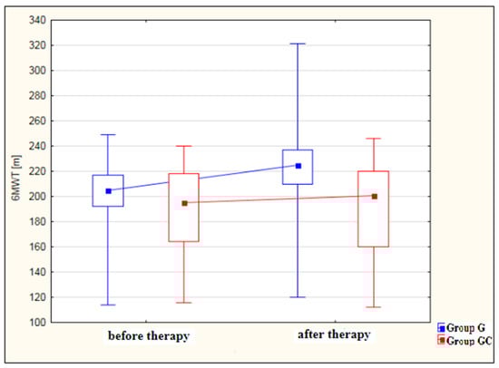 In our study, in 6MWT, statistically significant difference between the groups (G vs. GC) was observed after the treatments—significantly higher values of 6MWT were recorded in group G (p = 0.003).