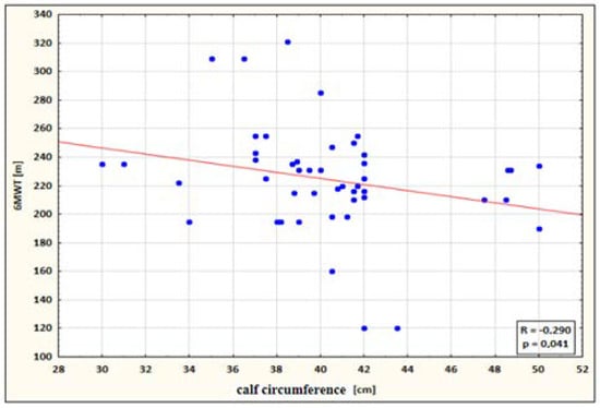 - a small negative correlation between calf circumference and 6MWT performance for the study group after therapy (the higher the circumference, the shorter the 6MWT distance) (Figure 4);