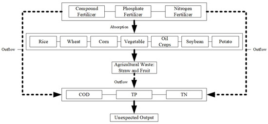 Figure 1 depicts the generation process of agricultural non-point source pollution. From 1978 to 2016, China’s total fertilizer-using increased by nearly six times [35], accounting for more than a 1/3 usage of global fertilizer, but the utilization rate was less than half of the world average [36], and long-term excessive use of agrochemicals will not be absorbed by plants to increase production but will lead to environmental pollution due to the loss of fertilizer [36,37]. In addition, due to small-scale decentralized agricultural operation, straw and waste fruits are difficult to be comprehensively utilized and will also cause environmental pollution if discarded.