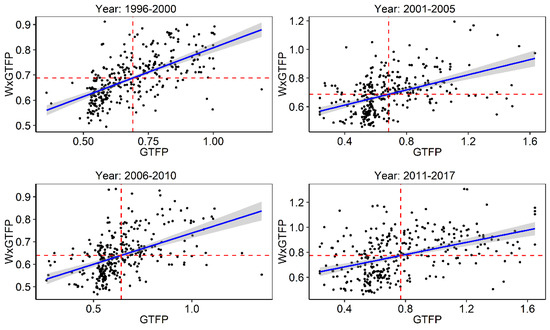 The Moran’s I test only describes the average level of spatial autocorrelation. If there is positive spatial autocorrelation in some regions and negative spatial autocorrelation in others, the two will cancel each other out, ultimately making the Moran’s I index an underestimate. Moran scatter map is used to further characterize the spatial autocorrelation between each region for the years 1996–2000, 2001–2005, 2006–2010 and 2011–2017. As can be seen from Figure 2, most of the regions are mainly clustered in the first and third quadrants, indicating that there is high–high and low–low clustering of GTFP in China, consistent with the aforementioned result that there is a significant positive spatial autocorrelation between regions.