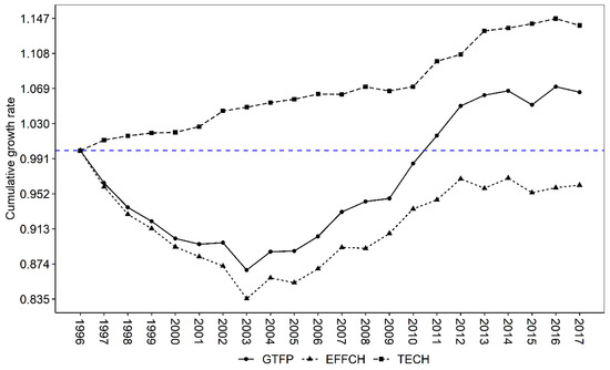 Cumulative change in average GTFP, EFFCH and TECH, 1996–2017. The blue dash line denotes 0 value horizontal line.