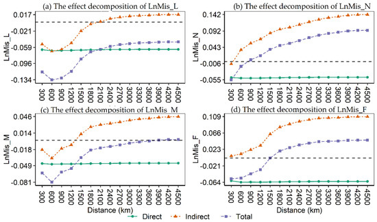 Figure 4 shows the trends in the direct, indirect and total effects. Where Figure 4a shows the effect decomposition of LnMis_L, Figure 4b shows the effect decomposition of LnMis_N, Figure 4c shows the effect decomposition of LnMis_M and Figure 4d shows the effect decomposition of LnMis_F. As can be seen from the figure, the direct effect is almost parallel to the horizontal axis, which is largely due to the fact that the calculation of the direct effect is mainly determined by the coefficients of LnMis and has little to do with the spatial distance weight matrix. In contrast, the indirect effect rises with increasing spatial distance, thus driving the total effect to also show an upward trend. This corroborates the above inference that the positive spillover effect of resource misallocation increases with increasing spatial distance and the number of cities included.