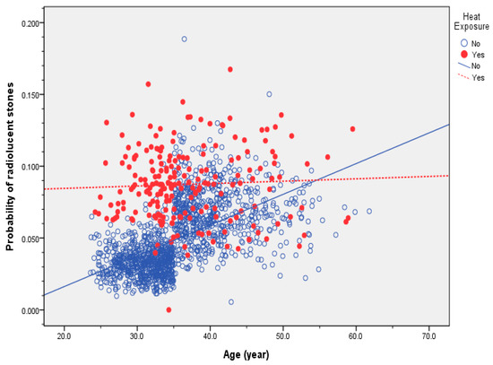 We used the probability of radiolucent nephrolithiasis calculated from the last model to evaluate the impacts of age and heat exposure, as shown in Figure 1. We found a lack of association between the probability of nephrolithiasis and age among workers with heat exposure (r2 = 0.002, p = 0.504), while the probability of radiolucent was nephrolithiasis significantly correlated with age in workers without heat exposure (r2 = 0.323, p < 0.001).