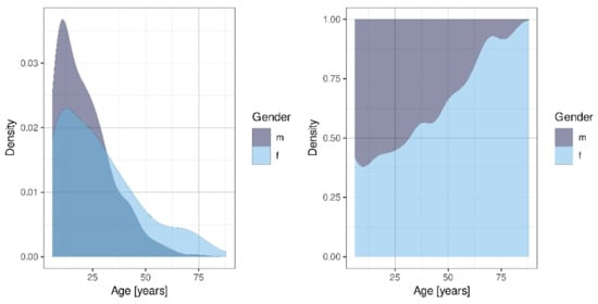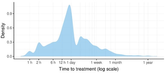 Statistical analysis was performed with R version 4.0.2 (R Core Team 2020, Vienna, Austria). Descriptive statistics (mean, SD) were provided for continuous measurements (time to treatment, age). Nominal measurements (e.g., gender, type of injury, type of accident) are summarized using frequencies and proportions as well as crosstabulations. Wilson score intervals and χ2 tests with continuity correction were calculated to compare interesting proportions. For visualization, kernel density estimators (KDE), a continuous version of histograms, were used. Graphs were created using package ggplot 2 (Wickham, Hadley 2009, New York, NY, USA).