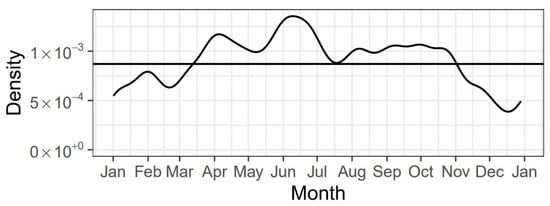 Figure 2. Kernel density estimation (KDE) plot for the relative likelihood of a TDI per date.