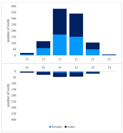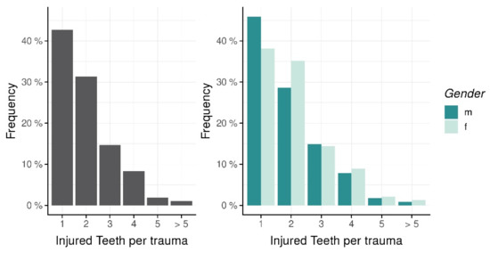 Five hundred sixty-eight (98.3%) patients suffered from dental trauma for the first time, whereas ten patients (1.7%) had previously experienced TDIs. Accompanying soft tissue injuries (laceration, abrasion, etc.) were present in 225 (38.9%) patients. In 42.7% (n = 247) of cases, only one tooth was affected. 31.3% (n = 181) showed two traumatized teeth within the same incident (Figure 4). Upper teeth were significantly more often affected by TDI (n = 496, 85.8%). In 6.7% (n = 39), TDI occurred in the lower jaw, 85.8% in the upper jaw, and 7.4% (n = 43) in the upper and lower jaw at the same time. The most frequently injured teeth were upper central incisors (n = 719, 63.5%), followed by upper lateral incisors (n = 231, 20.4%). Figure 5 summarizes the location of TDI monitored in this report. 85% (n = 960) of TDIs showed isolated types of injuries, whereas 15% (n = 172) were identified as combined injuries. With 53% (n = 596), fractures were the most frequent injury type. The most common types of fractures were uncomplicated crown fractures (no pulp exposure) (64.9%, n = 387), complicated crown fractures (with pulp exposure (15.4%, n = 92), enamel cracks (8.7%, n = 52) and crown-root-fractures (8.1%, n = 48). Three hundred eighty-two patients suffered from dislocations (34%). The three most prevalent subtypes of dislocations were concussions (21.7%, n = 83), subluxations (27.5%, n = 105), and lateral dislocations (26.7%, n = 102). Extrusions (6%, n = 23) were more frequently observed than intrusions (3.9%, n = 15). Fifty-two patients experienced avulsions (13.6%). In 14% (n = 154) of patients, both periodontal hard dental tissue injuries were present. The prevailing majority of combined injuries consisted of a combination of two different injury types. The most frequent combinations were crown fractures with increased tooth mobility (3.2%, n = 36) and crown fractures along with concussion (2.9%, n = 33). In five cases, a combination of three different injury types was observed. Four patients showed crown fractures, concussions, and enamel cracks, and one patient suffered an avulsion combined with crown and root fracture within the same tooth at the same traumatic incident. Table 3 gives an overview of the distribution of fractures, dislocations, and combined injuries. Table 4 provides an incidence matrix, including detailed information on the frequency of TDI occurrence in regard to different injury types. It also shows all possible combinatory variations of injury types. For instance, 34 patients suffered from extrusions. In 30 out of these 34 cases, no other injury was observed. In three cases, however, the extrusion occurred in combination with crown fractures. In one of these cases, even with pulp exposure. Another patient showed an extrusion and root fracture.
