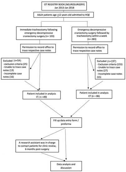- Huang, Y.-H.; Lee, T.-C.; Liao, C.-C.; Deng, Y.-H.; Kwan, A.-L. Tracheostomy in Craniectomised Survivors after Traumatic Brain Injury: A Cross-Sectional Analytical Study. Injury 2013, 44, 1226–1231. [Google Scholar] [CrossRef] [PubMed]