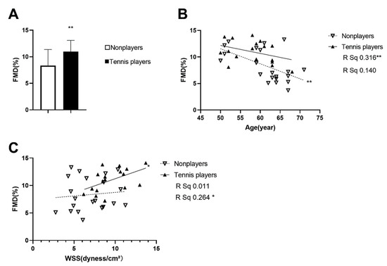 * p < 0.05 and ** p < 0.01 were considered statistically significant. Comparison of the flow-mediated dilation (FMD) between the tennis players and nonplayers (A); correlation of the FMD with increasing age between the tennis players and nonplayers (B); correlation of the FMD with increasing vessel wall shear stress (WSS) between the tennis players and nonplayers (C).