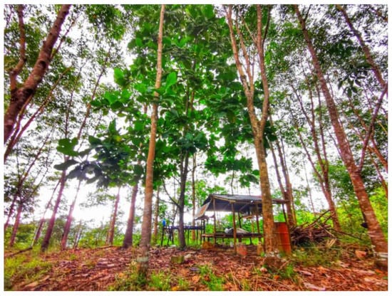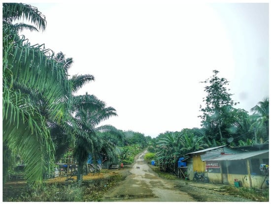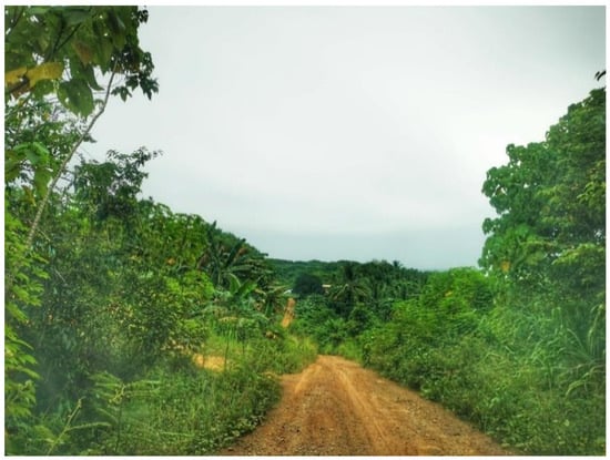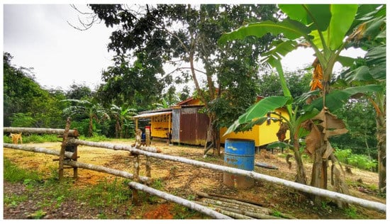 The study sites were located in areas surrounded by forests and hills. There was a mix of plantation areas such as commercial rubber and oil palm plantations, and family-owned banana and coconut farms (Figure 7). Houses were built individually on family land, with rubber and oil palm planted nearby (Figure 8). Fruit trees such as banana, mango, and papaya were also seen, and were an attraction for monkeys. Based on gatekeepers’ information, long-tailed monkeys are regularly seen in troops of 10 to 50. According to gatekeepers, the behavior of monkeys was concerning, as they were described to show no fear towards humans and destroyed their crops, plantation, and fruit trees. Water pools and stagnant water were found on the grounds, and possibly in tree holes. These are potential mosquito breeding sites and therefore a concern for malaria intervention (Supplementary File S2, Supplementary Materials).
